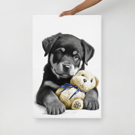 This labrador puppy is all wrapped up in a red bow just waiting for you to take her home. Who can resist that adoring, playful gaze? Put those adoring eyes on your wall with our high-quality canvas print.